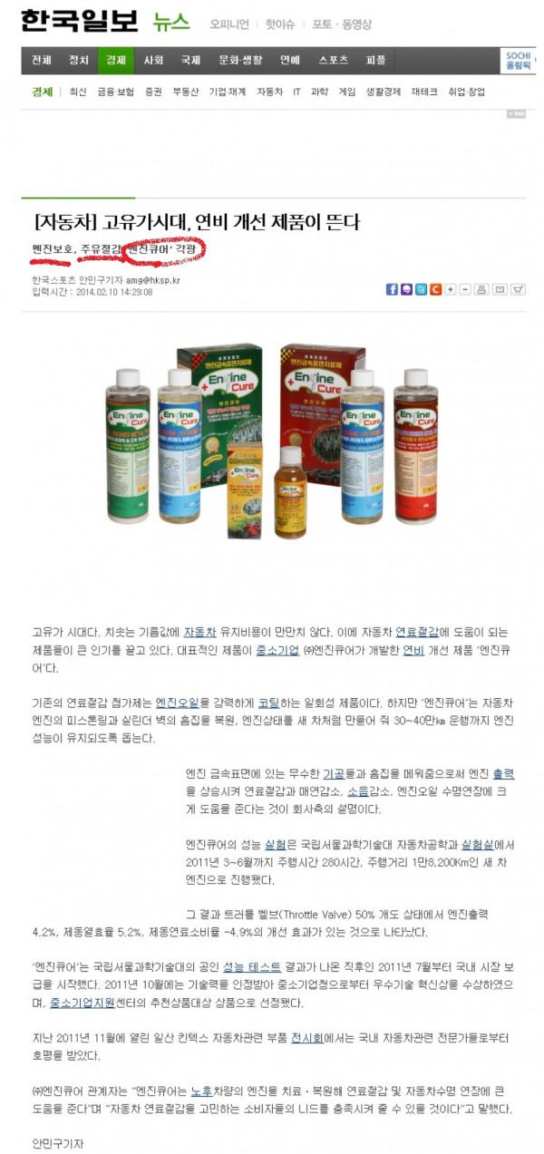 [한국일보] 2월10일 - 엔진보호, 주유비 절감 "엔진큐어"가 뜬다 페이지 정보 작성자 관리자 작성일 14-02-10 15:20 조회 2,085회 댓글 0건 본문 최근들어서 더욱 소비자분들의 인기를 반영하는 기사가 보도되고 있습니다.'엔진큐어' 사용으로 고유가를 극복해 나가시길 바랍니다.엔진큐어 임직원배상 이전글2014년상반기 히트상품선정[스포츠동아] 다음글[세계일보](2014.1.20일보도)-엔진큐어의 인기 실감 목록 댓글목록 0 댓글목록 등록된 댓글이 없습니다.
