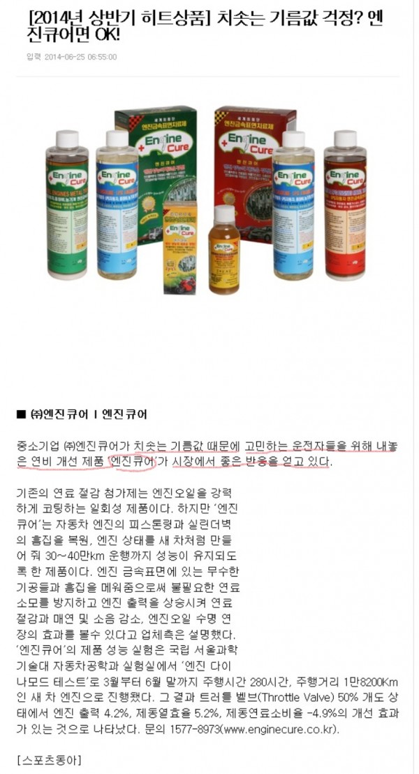 2014년상반기 히트상품선정[스포츠동아] 페이지 정보 작성자 관리자 작성일 14-06-25 08:44 조회 1,947회 댓글 0건 본문 새차일때 적용한 엔진큐어의 성적을 토대로 기사가 났네요.참고로 중고차 15만km운행 한 차에서는 연비가 무려 17.1% 향상되었습니다. 이전글[세계일보-상반기 히트상품] 엔진큐어 - 고유가시대 "연비개선" 최고의 선택 다음글[한국일보] 2월10일 - 엔진보호, 주유비 절감 "엔진큐어"가 뜬다 목록 댓글목록 0 댓글목록 등록된 댓글이 없습니다.