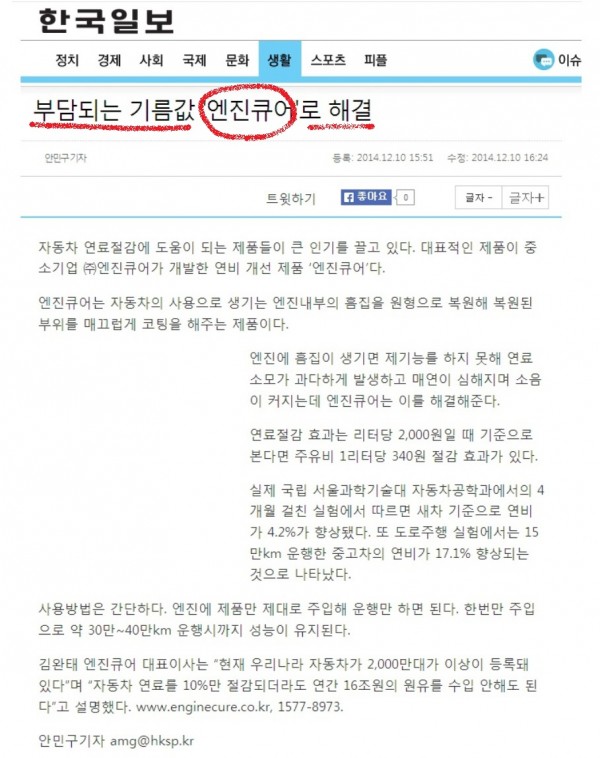 한국일보 - 2014.12.10기사(부담되는 기름값 엔진큐어로 해결) 페이지 정보 작성자 관리자 작성일 14-12-11 10:12 조회 2,294회 댓글 0건 본문 4년간 연속으로 기사가 게재되고 있으며, 개발기간 10년을 거쳐 4년간 판매하면서 사용소비자의 니즈를 충족시키는 제품은 역시 '엔진큐어'밖에 없음이 증명되는 것 같아 좋습니다. 이전글에너지경제신문,2014년12월26일>-겨울철 엔진보호 '엔진큐어'가 책임진다 다음글방송스케줄(11월10일부터~11월19일까지)입니다. 목록 댓글목록 0 댓글목록 등록된 댓글이 없습니다.