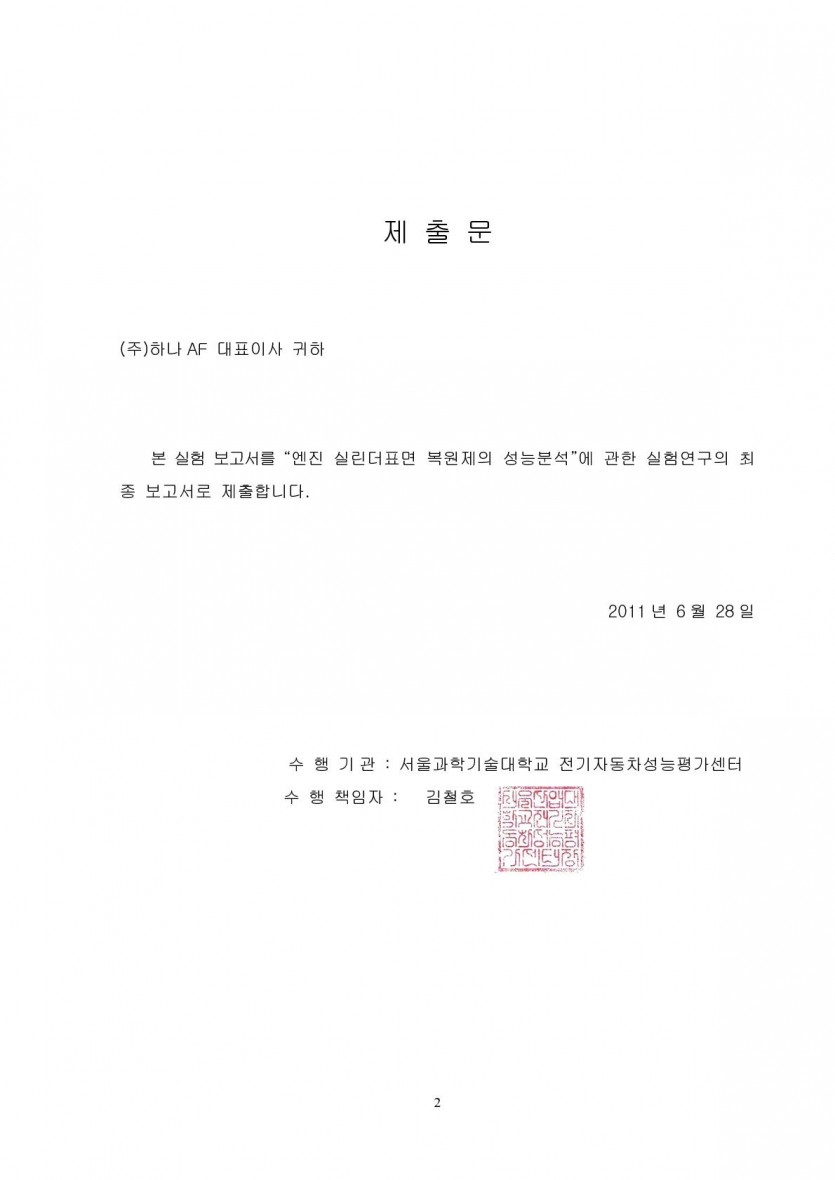 "엔진큐어" 신차(1만여km주행차량)에 실험 - "서울과학기술대학교 실험성적서" 페이지 정보 작성자 관리자 작성일 11-06-15 09:54 조회 5,223회 댓글 0건 본문 엔진큐어 공식자료입니다. 서울과학기술대학교에서 나온 엔진다이나모 테스트 공식자료입니다.테스트의 사용한 엔진은 18.200km 주행 한 신차의 엔진임을 말씀드립니다. 이전글6/24 22:30 머니투데이방송 "안혜경의 라이프U - 특집방송" 68회차 엔진큐어 방송. 다음글<타제품과의 비교자료> 입니다. 참고하세요. 목록 댓글목록 0 댓글목록 등록된 댓글이 없습니다.