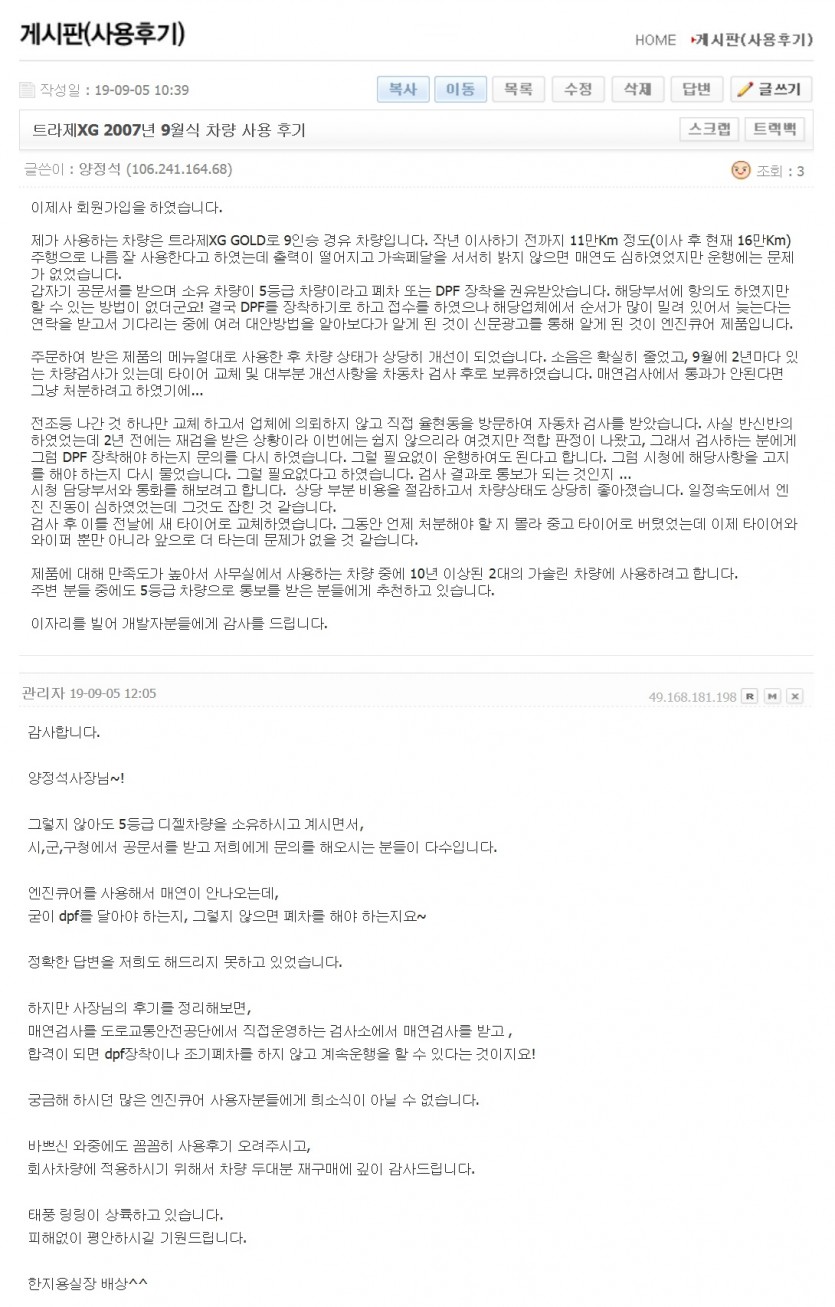 조기폐차 권고 대상에서도 제외되었음을 엔진큐어 사용후기로 알려 주셨습니다.