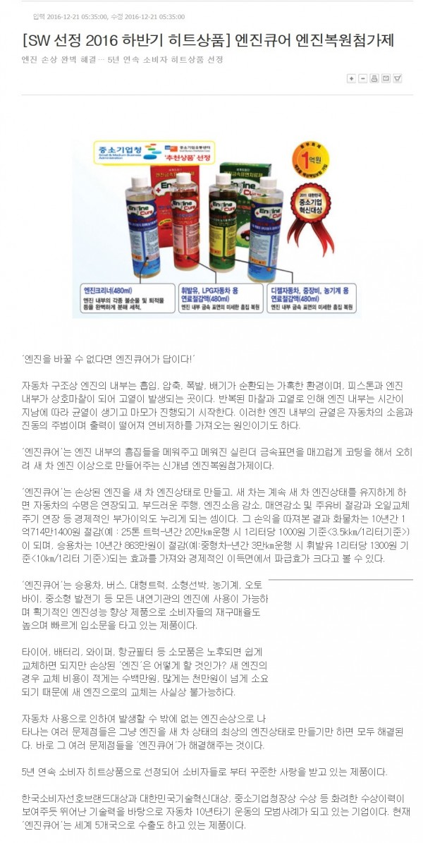 """경축"""[SW 선정 2016 하반기 히트상품으로 선정됨] - 엔진… 페이지 정보 작성자 관리자 작성일 16-12-21 08:59 조회 12,942회 댓글 0건 본문 6년 연속으로 소비자 히트 상품으로 선정되는 쾌거를 이루고있습니다. --- 이제는 소비자분들의 사랑으로 성장하는 "엔진큐어"가 되고 있슴이 명실공히 나타나고 있네요.......감사합니다. 이전글2011년식 아반떼오너입니다 다음글문의드립니다. 목록 댓글목록 0 댓글목록 등록된 댓글이 없습니다.